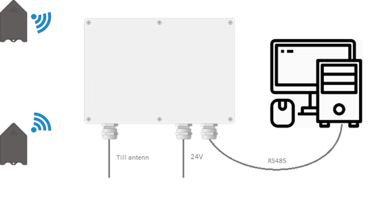 Systemet består av trådlösa enheter som sänder fuktkvotsdata till en centralenhet.