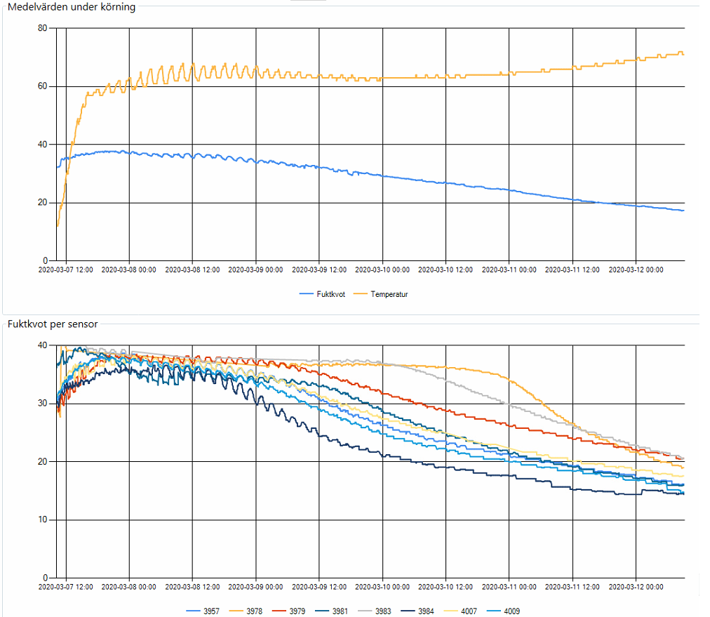 Alla mätvärden sparas i en databas för uppföljning och kontroll av torkningsprocessen.